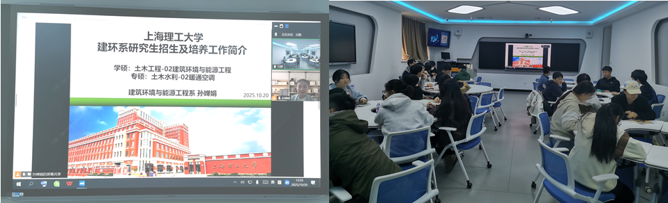 2025年10月18日,上海理工大学建筑环境与能源专业面向天津商业大学举办线上研究生招生宣讲会。本次宣讲由环境与建筑学院建环教工党支部书记、分管研究生招生培养工作副主任孙婵娟和教师代表陈瑞清老师开展,孙婵娟老师详细介绍了上海理工大学建环系的招生专业、培养方案、科研平台、实验条件和师资队伍等情况。吸引了大量应届本科生在线参与,现场互动热烈。